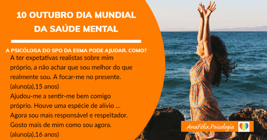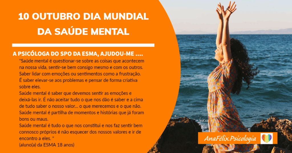 Dia 10 outubro, comemora-se o Dia Mundial da Saúde Mental. Como bem diz a Ordem dos Psicólogos Portugueses, ” Não há Saúde sem Saúde Psicológica” (https://escolasaudavelmente.